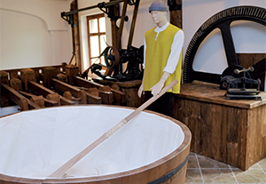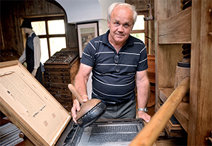 Induljunk hát az időutazásra: lépjünk be a középkorba, azaz Johannes Gutenberg 15. századi nyomdájába! Közelről megszemlélhető a könyvnyomtatás atyjának teljes műhelye, az eredeti hajszálpontos másaként. A betűasztal, a 269 féle karakterből álló gótbetű-készlett el – hiánytalanul, egyedül itt a világon! A mester íróasztala és nyomdagépe, azaz a sajtó, a hozzávaló összes kellékkel, festékes labdaccsal, nyomdamécsessel. És minden működik! Minden munkafolyamat látható, megérthető. Ahogy a szomszédos teremben a papírkészítés is. Mindehhez a házigazda saját kezűleg megépítette az egyetlen Európában működő középkori papírmalom, a bázeli mását, vízikerékkel egyetemben. Amíg beszélgetünk, kinn forogni kezd a hatalmas kerék, és a teremben beindulnak a papírzúzó kalapácsok. Mögöttük akkora áztató fakád, amekkorát csak filmen látni. A képzelet itt szabadon szárnyalhat, nem véletlenül nézik az élő múzeumot tátott szájjal a látogatók, az iskolásoktól az oldtimer autósokig, a japán turistáktól az ausztrál csoportokig.