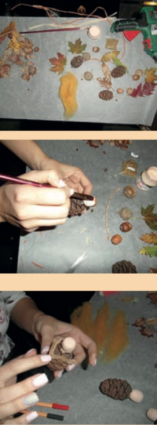 • A tölgymakkot ecettel zsírtalanítsuk le, ragasztópisztoly segítségével rögzítsük a tobozra, majd fessük le. • Az angyalok kezeit zseníliadrótból vagy összefont rafiaszalagokból készíthetjük, amit szintén a ragasztópisztollyal rögzítsünk a tobozhoz. • A szárnyakhoz az erdőben ősszel lehulló színes falevelek közül válasszuk ki a nekünk leginkább tetszőt. • A színes gyapjú hajon jól mutatnak a makk kalapok.